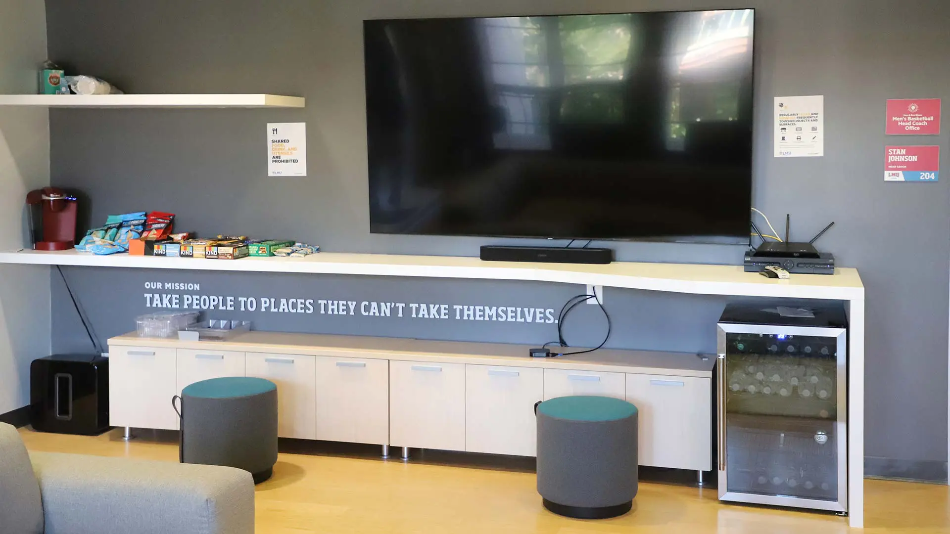 COMPLEMENTING THE RECENTLY REFRESHED COURT will be new fan seating to boost their game experience, capturing the excitement, energy, and intimacy in “Hank's House.” The Gersten renovation will move the coach's suites for men's and women's basketball to overlook the new fan seating and refreshed court, showcasing their visibility to recruits. Offices will be outfitted with the latest video equipment, giving teams an additional meeting space.